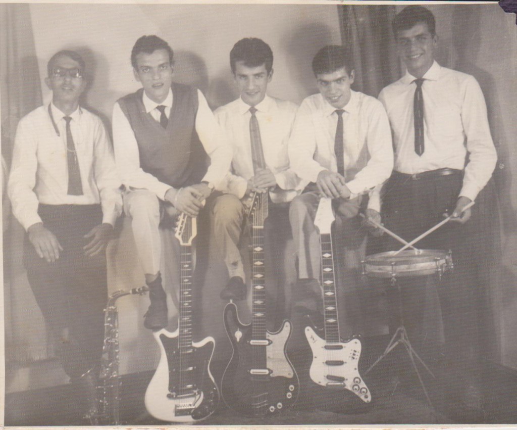 Meu primeiro conjunto, ainda em Vitória ES. Conjunto Blue Star: Sidney (sax), Eu (Raul guitarra solo), Nilson (Aladim-guitarra base), Fafeu (guitarra tenor), Beto (bateria)